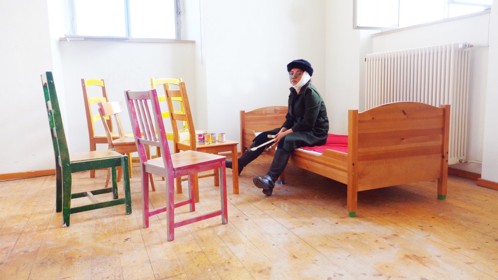 Van Gogh hat endlich ein kleines Atelier in Arles gefunden. Er hat seine Freunde eingeladen, aber niemand hat geantwortet außer Gauguin. Während er mit volle Freude auf ihn gewartet hat, richtete er sein Atelier ein. Zum Beispiel, einen Stuhl für Gauguin. Ich habe mich als Van Gogh verkleidet und mehre Stühle neben sein Bett gestellt. Ich habe mir dadurch vorgestellt, wie sich das Warten angefühlt hat. Warten auf Freunde …