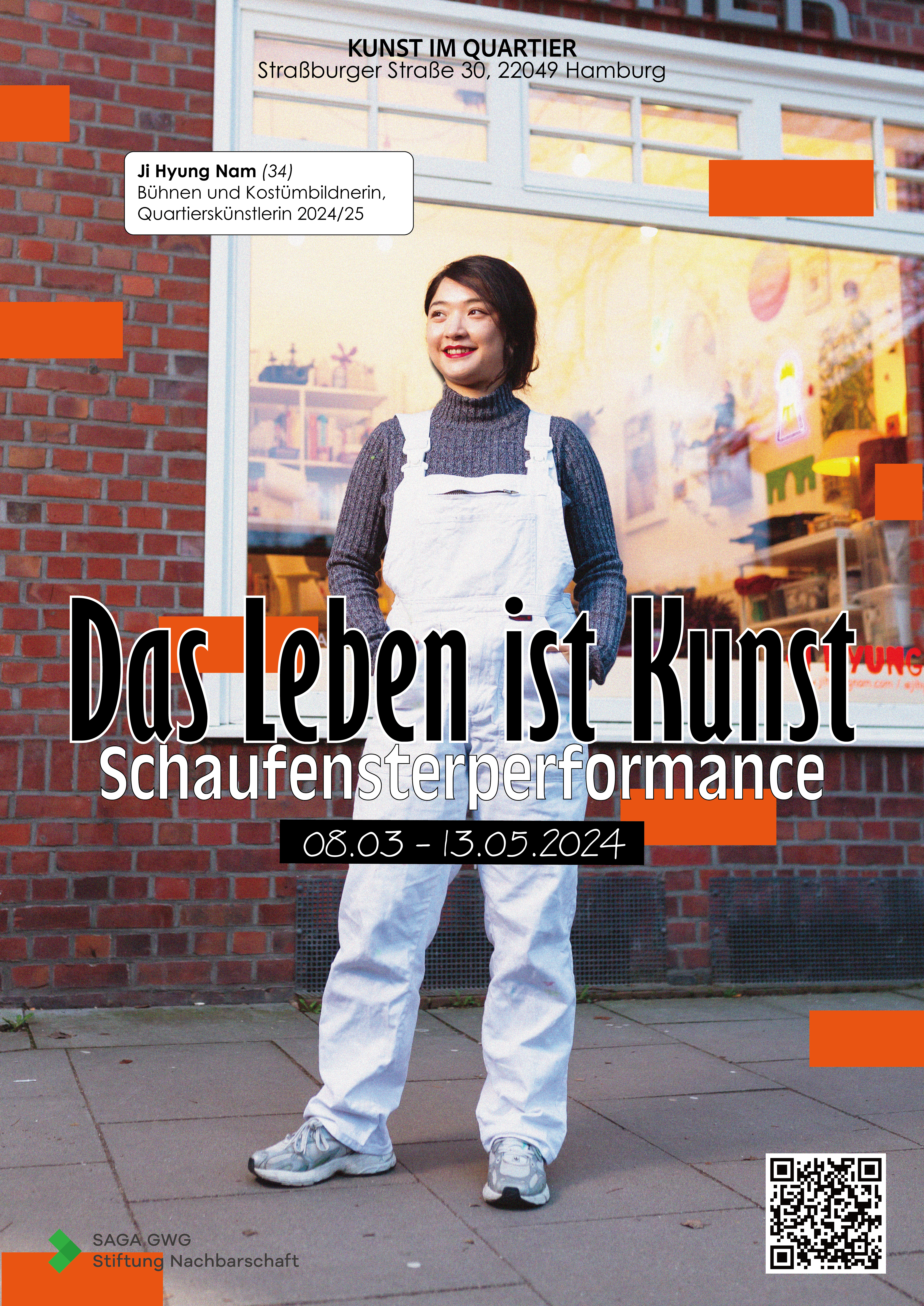 ‘Ihr offenes Atelier hat ein großes Schaufenster mitten an der Straßburger Straße. Zwei Jahre lang wird die Bühnen- und Kostümbildnerin Ji Hyung Nam hier arbeiten und Dulsberger Geschichten sammeln. Möglich macht das ein Stiftungsstipendium der SAGA.’